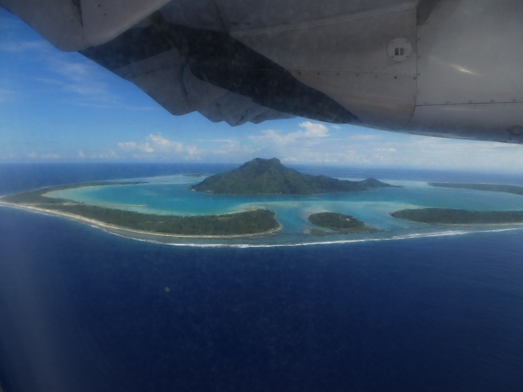 Anflug auf die Insel Maupiti (typisches Aussehen der meisten Gesllschaftsinseln)