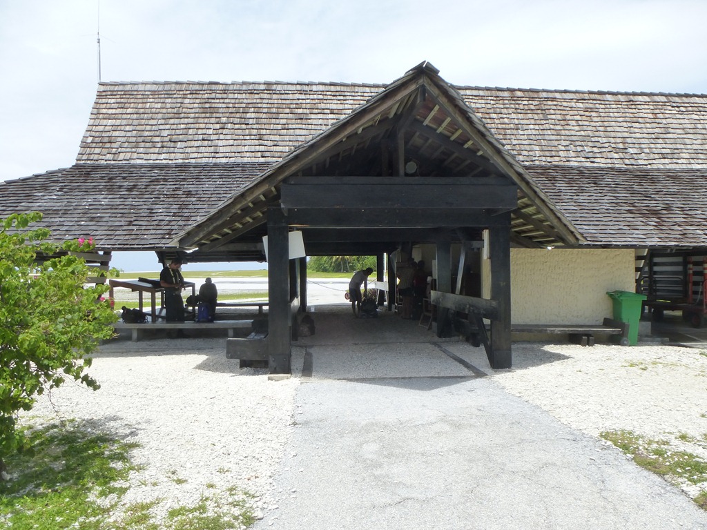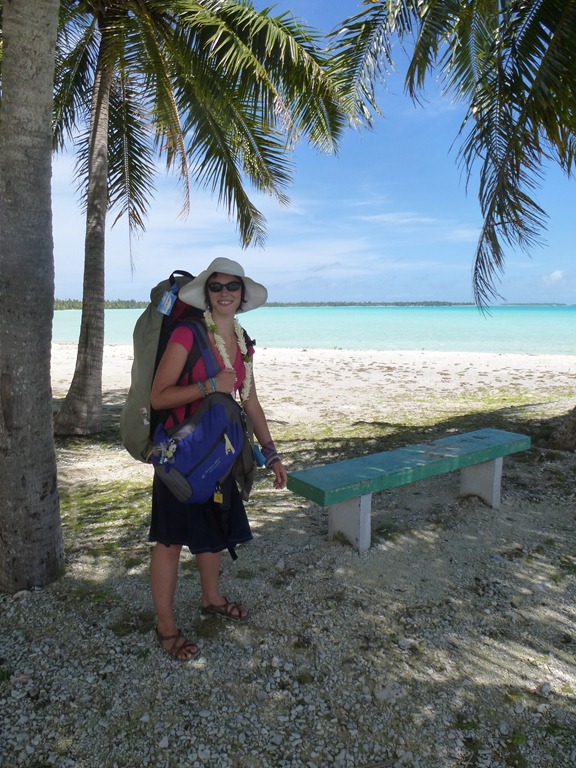 Mit Blumenkette und Gepäck beim Wartebereich des Flughafentransfer (per Boot)