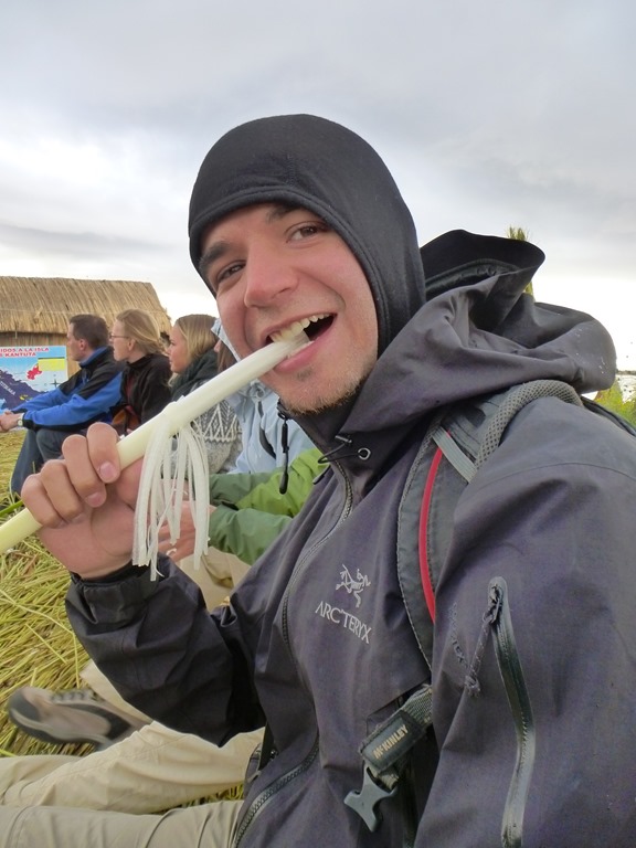 Wo “normale” Leute in Europa höchstens Skifahren, Bergsteigen oder mit Fallschirmen ab Klippen oder aus Flugzeugen springen, machen wir Sightseeing und essen niedliche Haustiere. Häääääää??? Nun aber alles einmal der Reihe nach: Unser gut zweiwöchiger Peru-Trip beginnt auf über 3’800 Metern über Meer…und zwar nicht auf irgendeinem beliebigen Berggipfel – die sind in der Regel hier höher als 5’000 – sondern in der Stadt Puno am Ufer des Titicaca-Sees, welcher auch Hauptgrund unseres Besuchs hier war: auf diesem See, welcher Peru von Bolivien trennt und nebenbei noch das höchstgelegene navigierbare Gewässer der Welt ist, lebt das Volk der Uros. Von Steuern und sonstigen Abgaben befreit, leben diese Menschen auch heute noch in Familienverbänden auf ihren Inselchen. Was weiter nicht speziell klingen mag erhält eine ganz neue Dimension, wenn man weiss, dass alles hier aus Schilf besteht – ja, sogar die Inseln selbst. Weil dadurch sowohl die eigenen vier Wände, wie auch der – mehr oder weniger feste – Boden unter den Füssen langsam vergammeln, muss hier alles jährlich ersetzt werden. Ausserdem gibt es auf den “Wohnsinseln” nicht einmal Toiletten…wer dringend einmal muss, schwingt sich dafür auf eines der (Schilf-) Boote und fährt zu einer der dafür vorgesehenen Orte. Alles sehr interessant. Allerdings gibt es sicherlich einfachere Methoden, um sich vor Steuern zu drücken Smiley