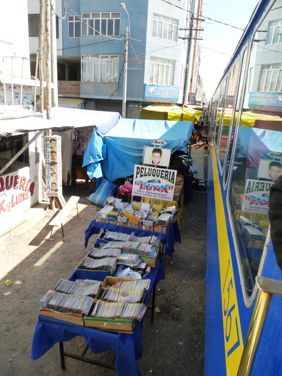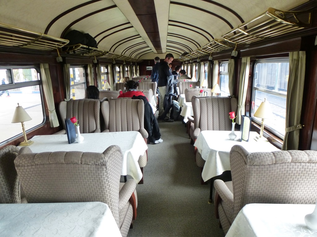 Um Puno gebührend abzuschliessen und uns bereits möglichst optimal auf das königliche Cusco einzustimmen, haben wir die Strecke zwischen den beiden Städten mit dem “Andean Explorer”, einem Touristenzug im Stile des Orientexpress zurückgelegt. Während einem ein exquisites 3-Gänge-Menü und später der obligatorische “Afternoon-Tea” serviert werden, ziehen die wunderschönen Landschaften der peruanischen Anden vor dem Fenster vorbei. Zwischenzeitlich sorgen eine typisch peruanische Band und eine traditionelle Modenschau (natürlich mit Kaufoption) für Abwechslung. Und wenn einem trotz allem einmal langweilig werden sollte, kann man sich immer noch in den halboffenen Panoramawagen am Ende des Zuges begeben, um frische Luft zu schnappen: empfiehlt sich insbesondere bei der Durchquerung der Märkte in den Städten unterwegs: weil der Zug nur einmal täglich verkehrt, werden in der Regel auch die Schienen als Verkaufsfläche genutzt; bei Eintreffen der Eisenbahn werden die Waren dann auf den Geleisen einfach so verstaut, dass der Zug mühelos darüber hinwegfahren kann.