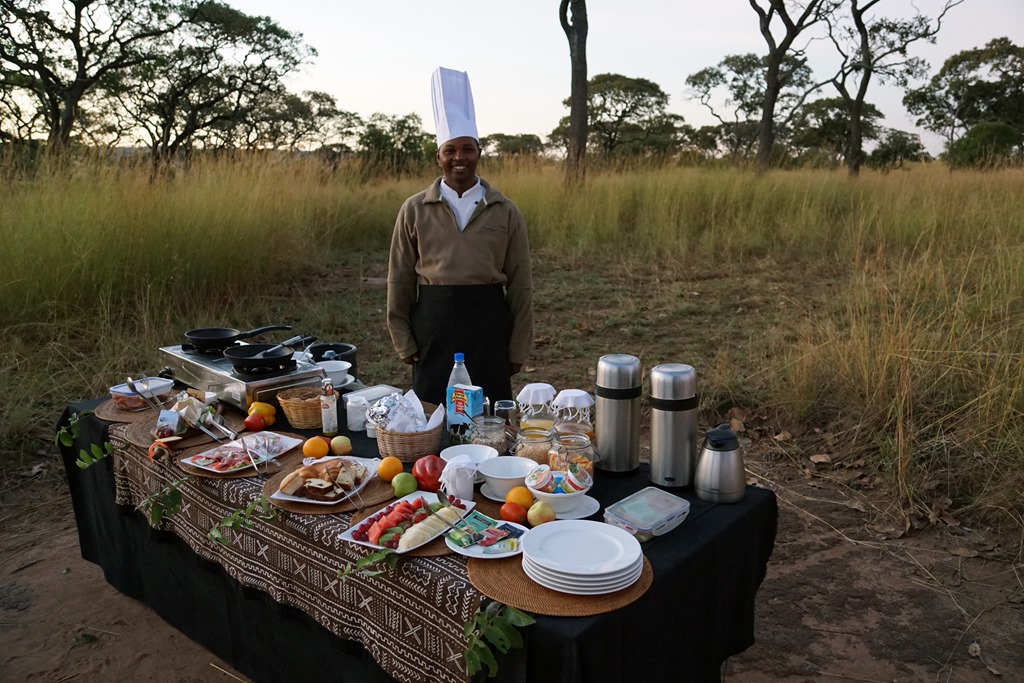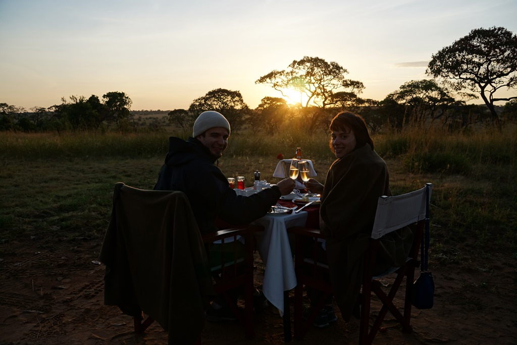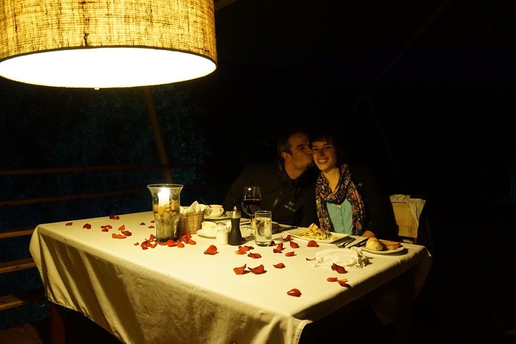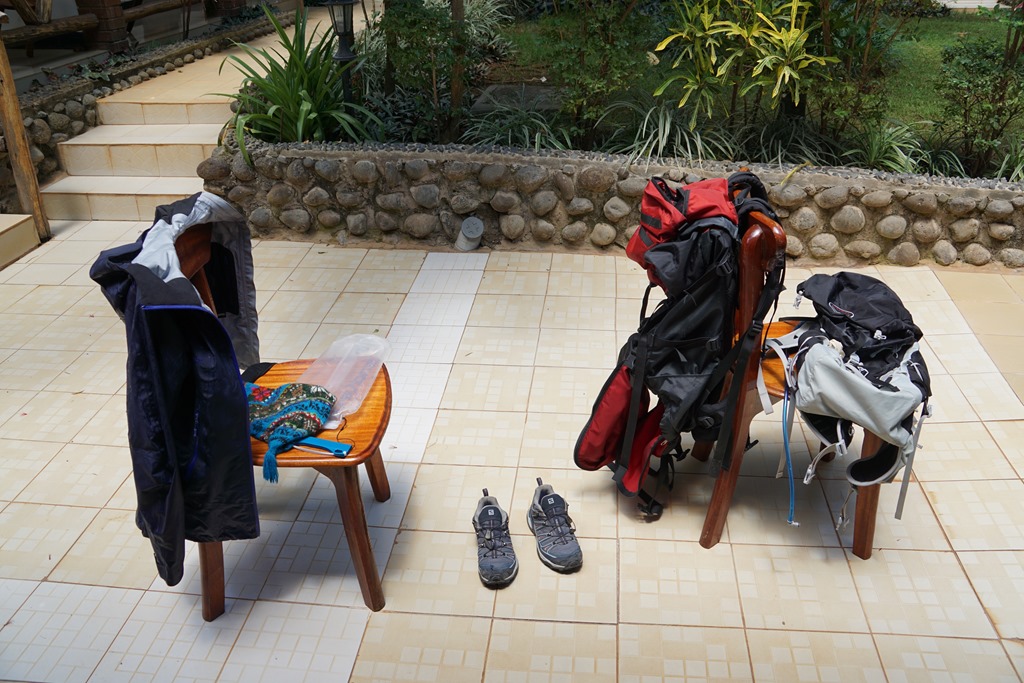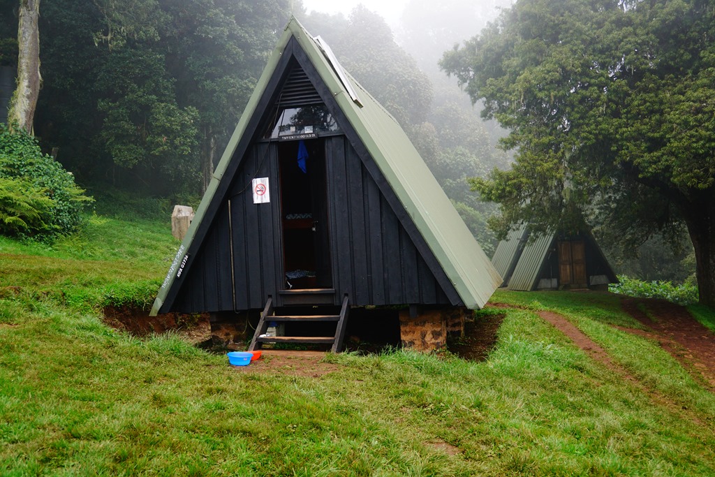 In der Hütte angekommen, wird man in das tägliche „Prozedere“ eingeführt: bei Ankunft wird einem vom „Butler“ die Dusche aufs Zimmer gebracht, will heissen eine Schale mit warmem Wasser und Seife. Nachdem man sich dann frischgemacht und die eine edle Kopfbedeckung (Sonnenhut) gegen die andere (Wollmütze) ausgewechselt und sein Himmelbett (Schlafsack und Isomatte) gerichtet hat, wird man in den Kronsaal (Gemeinschaftshütte) geleitet, wo ein wunderbares Amuse-Bouche (Popcorn mit heissem Tee) gereicht und anschliessend vom Chefdiener des Hofstaates das mehrgängige Bankett (Suppe zur Vorspeise, Fisch oder Fleisch mit Reis oder Kartoffeln als Hauptgang und Früchte zur Nachspeise) aufgetragen wird. Das Essen ist dabei erstaunlich frisch und gut und spricht für die exzellenten Köche. Übrigens wird man auch morgens durch den „Kellner“ geweckt und auf Wunsch mit Kaffee, Tee und Waschwasser versorgt. Weil im Hofstaat leider kein Leibarzt dabei ist, wird vom Guide jeden Abend auch Sauerstoffsättigungsgehalt und Puls gemessen, damit die Besteigung im Falle von gesundheitlichen Problemen frühzeitig abgebrochen werden kann.