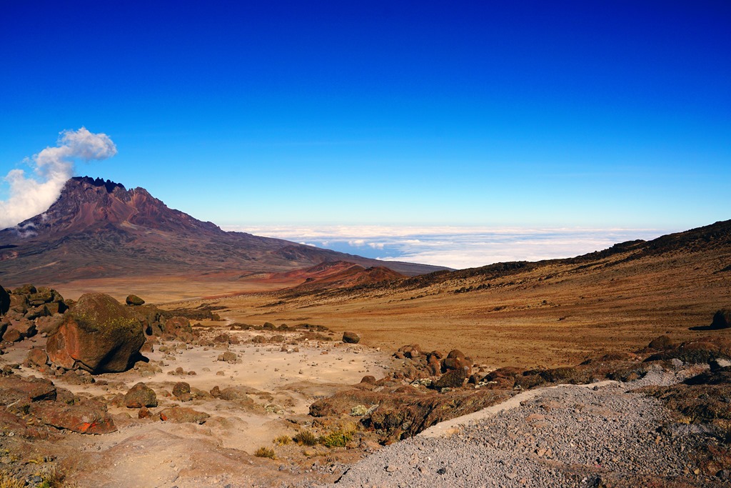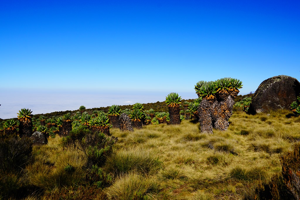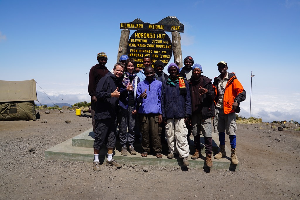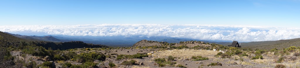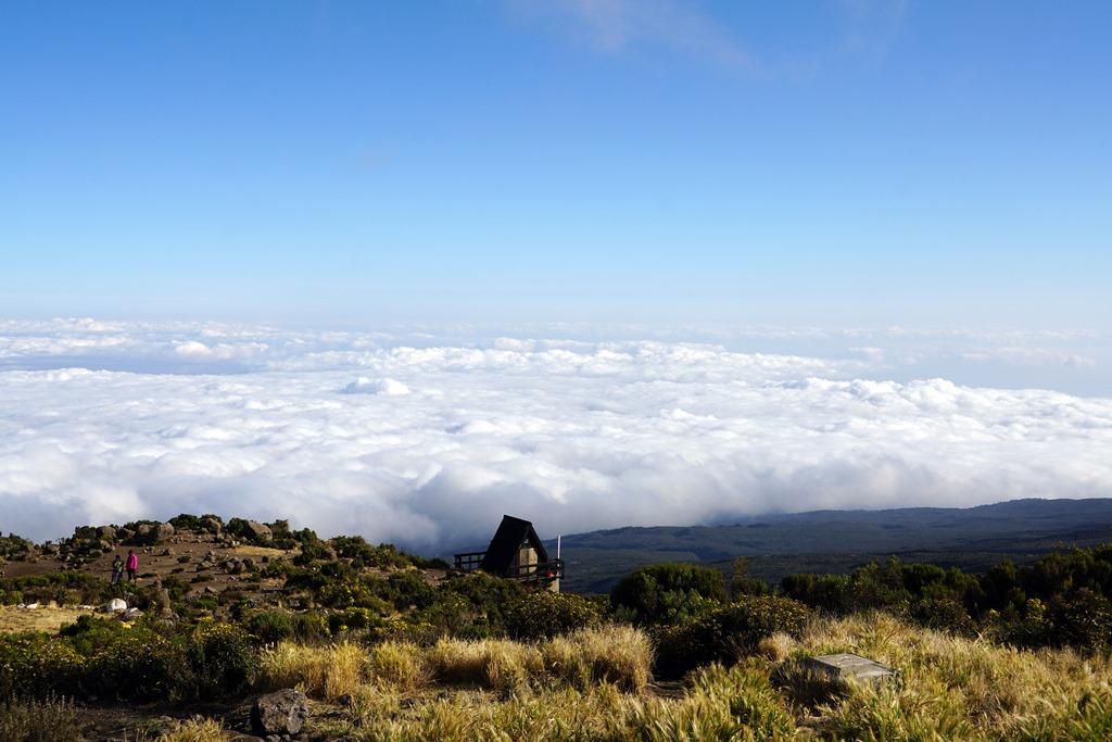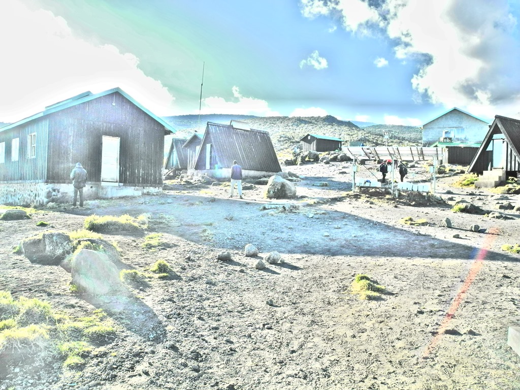 Tag 2 führte uns 12 km durch eine Moorlandschaft, von 2720m ü.M. auf 3770m ü.M. Da der Weg sehr breit und einfach ist, kommt man nach knapp sechs Stunden Wanderung bei der Horombo-Hütte an, von welcher man zum ersten Mal den Gipfel des Kili aus weiter Ferne sieht. Da sich auch der Nebel endlich lichtet, sollte man trotz sinkender Temperaturen unbedingt auf genügend starken Sonnenschutz achten. Nur so kann man verhindern, als halbseitig durchgebratener Hummer anzukommen…
