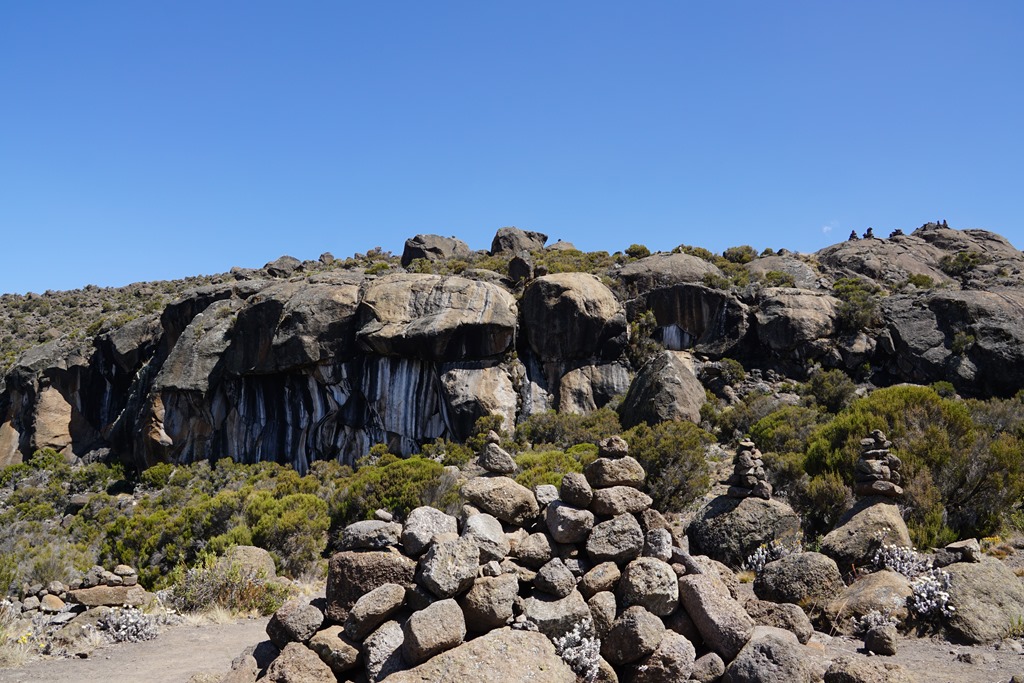 Der dritte Tag ist der Erholung und Akklimatisierung gewidmet: man übernachtet ein zweites Mal in der Horombo-Hütte und unternimmt tagsüber nur eine Kurzwanderung zu den 400 Metern höher gelegenen „Zebra Rocks“, einer schwarz-weiss gestreiften Felsformation, von welcher man zum aller ersten Mal den gesamten restlichen „Weg“ bis zum Gipfel sehen kann. Oh Schreck, da kommt ja noch ordentlich etwas auf uns zu!