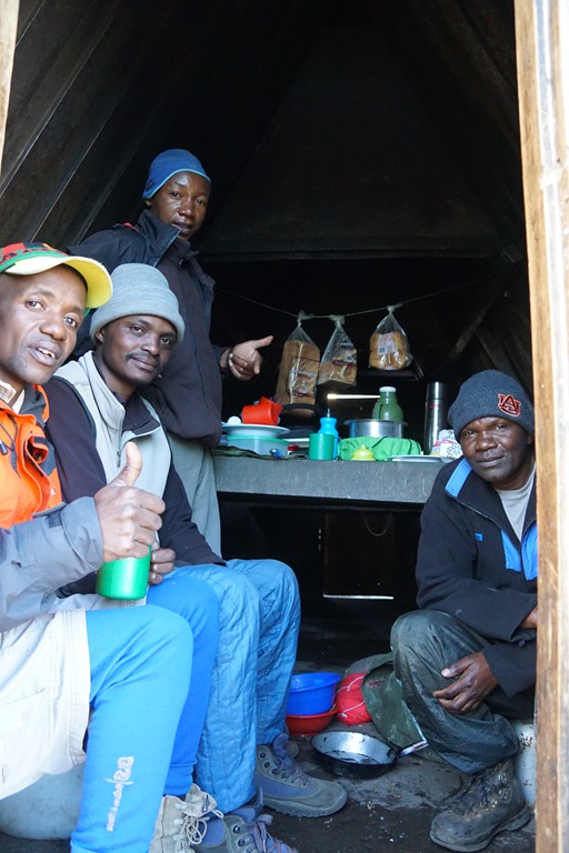 Weil die Horombo-Hütte nicht nur Schlafplatz von „Aufsteigern“ ist, sondern auch den Absteigenden als letzte Unterkunft dient und darüber hinaus noch einen Campingplatz für eine andere Route beherbergt, ist es hier mit der Ruhe definitiv vorbei. Nur dem eisig kalten Wasser ist es zu verdanken, dass man trotzdem in der Dusche (ja, wirklich; die gibt es hier!) alleine ist. Die Hütten sind hier wesentlich grösser und auf mehr Gäste ausgerichtet. Unsere beiden „Mitbewohnerinnen“ aus Österreich kannten wir bereits vom Vorabend. Die Mädels waren sehr locker und sympathisch, was aber evtl. u.a. auch den „Drogen“ (Medikamente gegen die Höhenkrankheit) zu verdanken war, welche fleissig eingeworfen wurden. Wir hatten immer grossen Spass und die beiden sind uns bis zum Ende auch jede Nacht erhalten geblieben.
