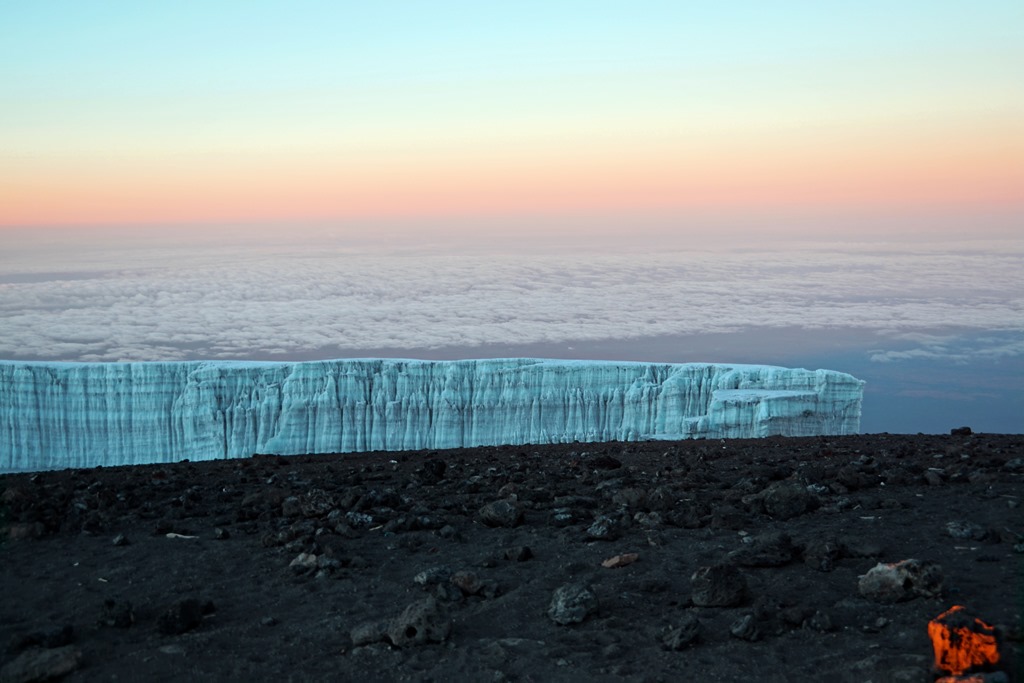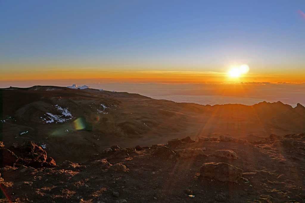 Leider dauerte der Schlaf für uns nicht ganz solange, was wohl aber auch den Geräuschen zu verdanken ist, welche eine „unserer“ Österreicherinnen bei der panischen Suche nach Medikamenten (alles, was noch nicht geschluckt wurde, wurde jetzt eingeworfen) verursachte. Nach Tee, Keksen und dem sorgfältigen „mumifizieren“ der Teilnehmer (Jenny trug 2 Paar Socken + Wärmepads; 3 Paar Hosen; 8 Oberteile und 2 Paar Handschuhe + Wärmepads) startete um Mitternacht der Gipfelsturm. Die ersten knapp 1000 Höhenmeter zum Gilman’s Point (5681m ü.M.) sind hardcore und nahmen bei uns fünf Stunden in Anspruch: zuerst geht es „nur“ steil bergauf (und mit steil meinen wir richtig steil!), dann setzt sich das Ganze in einem Geröllfeld aus Vulkanasche fort (steil UND man sinkt ein) und am Ende folgt eine längere Klettereinlage über grosse Brocken an Vulkangestein. Nichtsdestotrotz haben wir (leider) noch eineinhalb Stunden vor Sonnenaufgang den Punkt erreicht, bei welchem der Kili als bestiegen gilt. Weil wir unsere Extremitäten aufgrund der Kälte (ca. -20 Grad) und des extremen Windes bereits nicht mehr spüren konnten (auch zwei Wochen nach der Besteigung ist in einigen Fingerkuppen das Gefühl noch nicht 100%ig zurückgekehrt) und der Sonnenaufgang erst für 06:30 angesagt war, haben wir sofort die restlichen Kilometer auf dem Kraterrand entlang der drei Gletscher in Richtung Uhuru-Peak in Angriff genommen. Und dann der grosse Moment: um 06:40 stehen wir auf dem höchsten Punkt Afrikas bzw. auf dem Gipfel des höchsten freistehenden Berges der Welt (5895m ü.M.)! Der Ausblick auf die Gletscher, den Krater und bis hinunter in die Savannen von Kenia und Tansania ist gewaltig und entschädigt für alle Mühen! Trotzdem fällt die Entscheidung schnell, nach einigen Fotos und dem Anbringen unseres „Hochzeitsschlosses“ auf dem Peak den Abstieg sofort wieder in Angriff zu nehmen. Auf dem Weg hinunter begegnen uns auch viele Menschen, welche es nur gestützt von ihren Guides schaffen oder vorher entkräftet aufgeben, ganz zu schweigen von all den Kotz**den am Wegesrand…