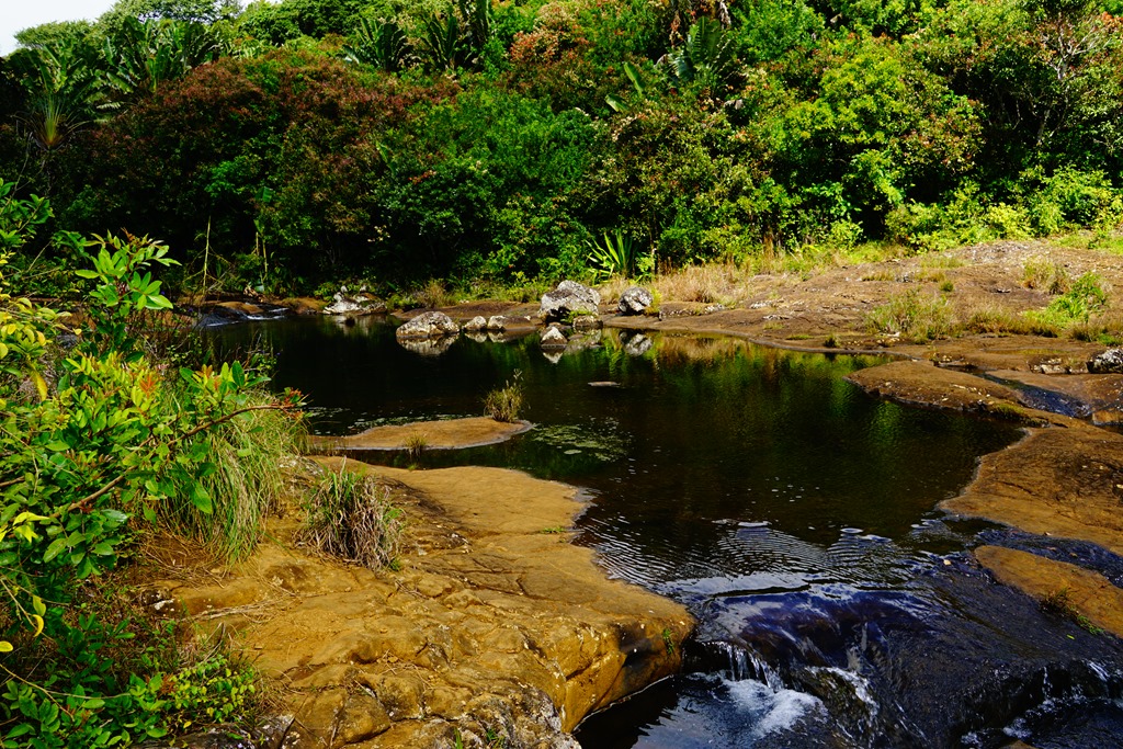 Dagegen ist das Wasser der „7 Cascades“ richtiggehend klar. In einigen der Becken dieser sieben Wasserfälle, welche sich ebenfalls im tropischen Zentrum der Insel befinden, kann man sogar baden – vorausgesetzt, dass man sich bei ca. 13 Grad hineintraut. Diese Abkühlung muss man sich jedoch zuerst hart erarbeiten. Weil der ca. 45-minütige Abstieg bis oberhalb des fünften Wasserfalls auch nicht ganz ungefährlich ist und das Wort „Wanderweg“ dem Kampf durch Dschungel, Steilhänge und über glitschige Steine nicht annähernd gerecht wird, sollte man nur mit einheimischem Führer unterwegs sein. Einen solchen findet man bei den Parkplätzen an den offiziellen (und bequem erreichbaren) Aussichtspunkten leicht, sofern denn das nötige Trinkgeld vorhanden ist. Einmal beim fünften Fall angekommen (die beiden letzten sind extrem hoch und nur mittels Seilsicherung „bewanderbar“), beginnt ein distanztechnisch viel kürzerer, dafür aber umso steilerer Aufstieg zurück auf den Rand der Schlucht. Muskelkater ist nach dieser Tortur garantiert – sogar wenn man ein Jahr zuvor den Kili bestiegen hat.