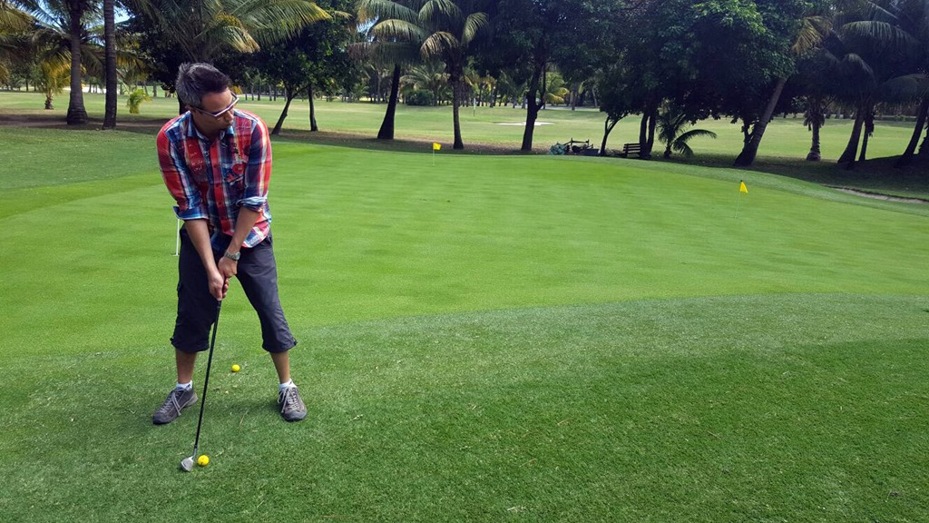 Apropos Kulinarik: die zweite Woche auf Mauritius verbrachten wir im Süden der Insel in einem Hotel, in welchem etwas ganz anderes die Attraktion darstellte: die acht Restaurants verschiedenster Stilrichtungen. Von asiatischer Fusionsküche, über ein auf Meeresfrüchte spezialisiertes Lokal bis hin zum klassischen Italiener war alles dabei, so dass wir eigentlich bereits nach dem Frühstück wieder sehnlichst das Abendessen erwarteten 😉 Damit die Gewichts- und Umfangzunahme nicht so gross war, dass wir nicht mehr ins Flugzeug passen, musste Bewegung her. Klar, war auch Kitesurfen wieder ein Bestandteil (per Zufall waren sogar die weltbesten Kiter wegen eines Wettkampfes im gleichen Hotel und wir konnten ihnen tagsüber zusehen) und klar, hätte es auch das – auf Mauritius in den meisten Hotels übliche – kostenlose Angebot an diversen Wassersportmöglichkeiten gegeben. Da wir aber etwas Neues probieren wollten, war uns dies nicht genug; und so kam es, dass wir eine Sportart intensiver testeten, von welcher wir früher aus den verschiedensten Gründen immer gesagt haben, dass wir sie nie, nie, nie praktizieren würden: Golf. Und obwohl verschiedene Klischees zutreffen – ja, es ist so snobby und man MUSS ein Oberteil mit Kragen auf dem Platz tragen; ja, es ist ziemlich teuer; ja, die Bewegungskomponente wird langfristig aufgrund von Fahren mit den Golf-Caddys nicht so hoch sein – hat es uns gefordert, Spass gemacht und wir hatten in den ersten Tagen sogar Muskelkater vom Üben der korrekten Schwünge! Wir können uns definitiv vorstellen, es zu einem späteren Zeitpunkt noch einmal zu versuchen und besser zu werden. Ist auch bitter nötig, haben wir doch den Rasen gehörig „umgegraben“ und bei unserer ersten Runde auf dem „richtigen“ Platz sogar mehrere Bälle auf die angrenzende Strasse geschlagen J