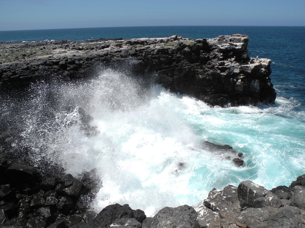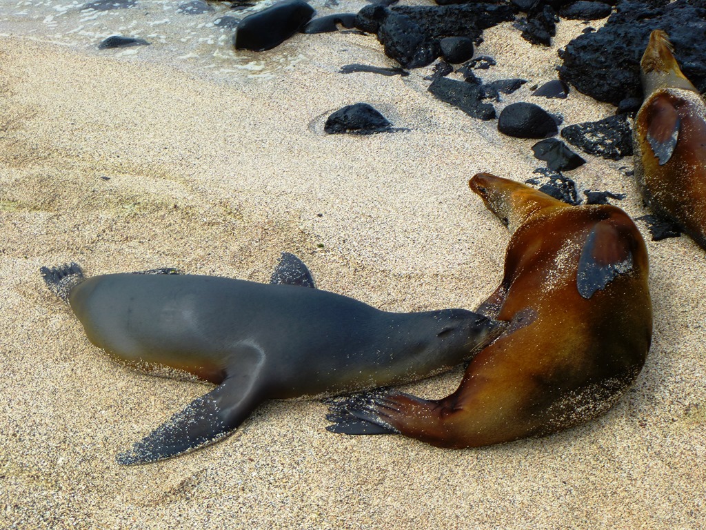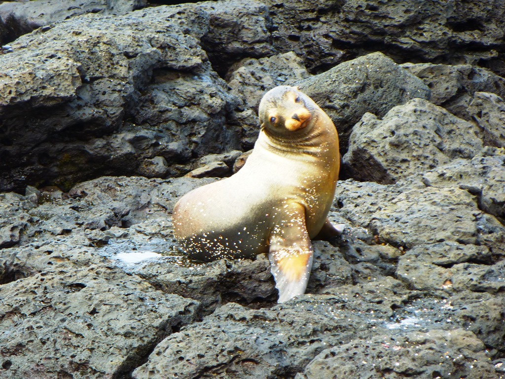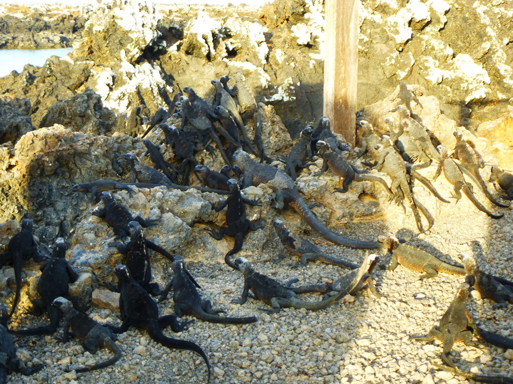Enstprechend froh waren wir, als wir auf der Insel ankamen und das Morgenessen immer noch da war, wo es hingehörte… Immerhin konnten wir uns die nächsten Tage herrlich entspannen, gibt es auf Isabella doch nicht allzu viele Ausflugsziele mit fixem Zeitplan, da die meisten Attraktionen der Insel individuell zu Fuss erkundet werden können: wir besuchten eine Aufzuchtstation für Riesenschildkröten, liefen die ewig langen Strände mit ihren grossen Iguana-Populationen ab und schauten Seelöwen und den Galapagos-Pinguingen (die weitest nördlich lebende Pinguin-Gattung) beim schwimmen zu. Der einzig geführte Ausflug während diesen vier Tagen brachte uns zu kleinen Lavafelsen dicht vor der Küste, welche von “stapelweisen” Iguanas (die Tiere liegen aus Gründen des verminderten Wärmeverlustes tatsächlich des öfteren in mehreren Lagen übereinander) bewohnt und von Weissspitzen-Riffhaien als Versteck vor grösseren Artgenossen genutzt wird. Dafür lassen sich die Raubfische bei Flut in eine flache Lagune spülen, welche bei Ebbe vom Ozean und damit vor den Feinden abgeschnitten ist. Und endlich, endlich gabs auch die heiss ersehnten Blaufuss-Tölpel aus nächster Nähe zu sehen. Mission erfüllt ![]()