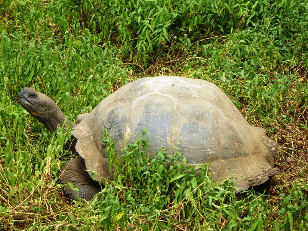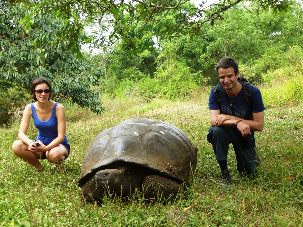 Weil man in einem so vielfältigen Paradies natürlich keinen Tag “verschwenden” darf, gings auch an Tag drei entsprechend mit Programm weiter: ein Taxifahrer, welcher auch als (spanischsprachiger) Tourguide diente, fuhr uns zu den erloschenen Vulkankratern auf Santa Cruz, deren unterirdische Überbleibsel – “Lavatunnel” genannt – und hat bei der letzten Etappe – dem Besuch eines Bauernhofs, auf dessen Grund und Boden sich eine grosse Population der Galapagos-Riesenschildkröte niedergelassen hat – sogar den Fährtenleser gespielt und die behäbigen Riesenviecher im Busch für uns aufgespürt. Speziell diese gewaltigen Tiere haben bei uns einen bleibenden Eindruck hinterlassen: ein paar Zentimeter gross bei Geburt, wachsen die Schildkröten ein (über 200-jähriges) Leben lang und erreichen kurz vor ihrem Tod ein Gewicht von knapp 260 Kilogramm! Dass es bei diesem Gewicht und den kurzen Beinen alles andere als gestresst zugeht, ist wohl selbstredend ![]()