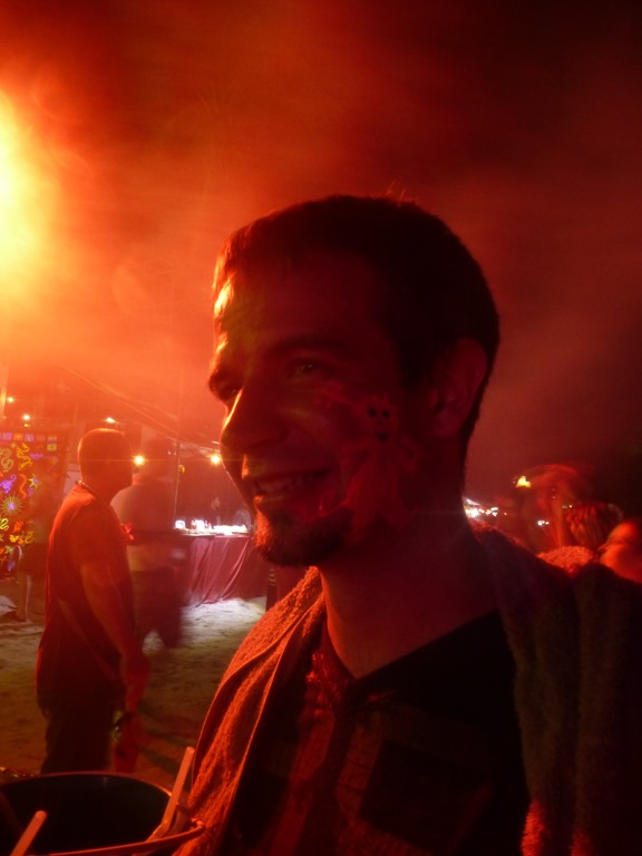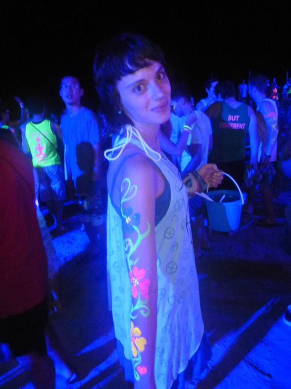 Und wie war die Party, wenn man sie nicht gerade damit verbracht hat, auf das Ende des Trocknungsprogramms zu warten oder bestohlen zu werden? Sehr empfehlenswert: es gibt tolle Musik mit interessanter Beleuchtung, welche durch die Bemalung des eigenen Körpers mit fluoriszierender Farbe noch mehr zur Geltung kommt, viele verrückte (oder betrunkene?) Menschen, welche sich für nichts zu schade sind und sogar bei den öffentlichen “Seilhüpfwettbewerben” mit brennendem Seil mitmachen und zweimal duschen ist auch noch inklusive! Zweimal? Ja, einmal auf der Hinfahrt und einmal auf der Rückfahrt (obwohl kein Sturm mehr da war, ist unser Kapitän aufgrund von “Stalldrang” so schnell gefahren, dass kein Kleidungsstück trocken blieb)! Ein wahrhaft “feuchtfröhliches” Erlebnis!