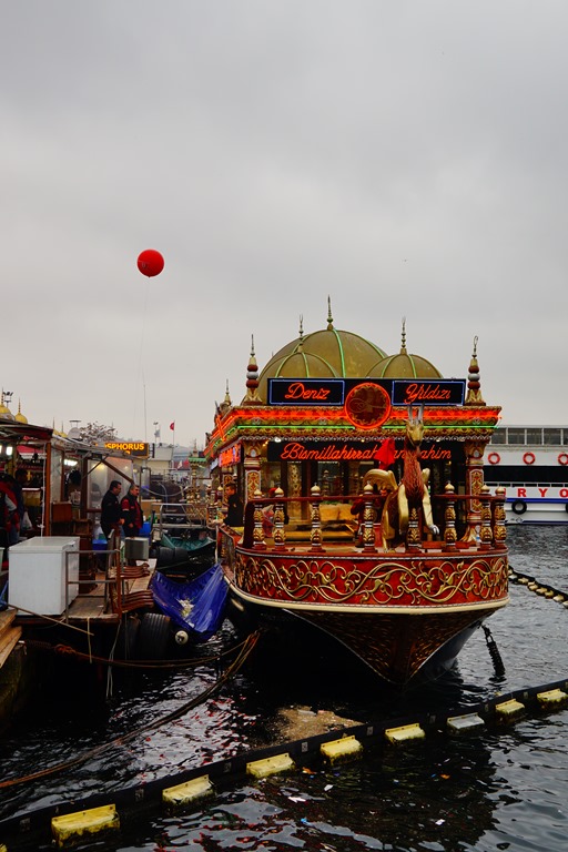 Der Hafen von Istanbul mit seinen asiatischen Imbissbuden, welche auf Schiffen stehen und die Bosporusbrücke, welche Europa und Asien verbindet
